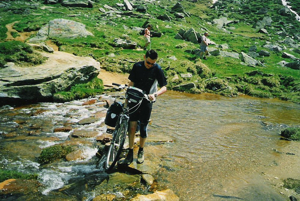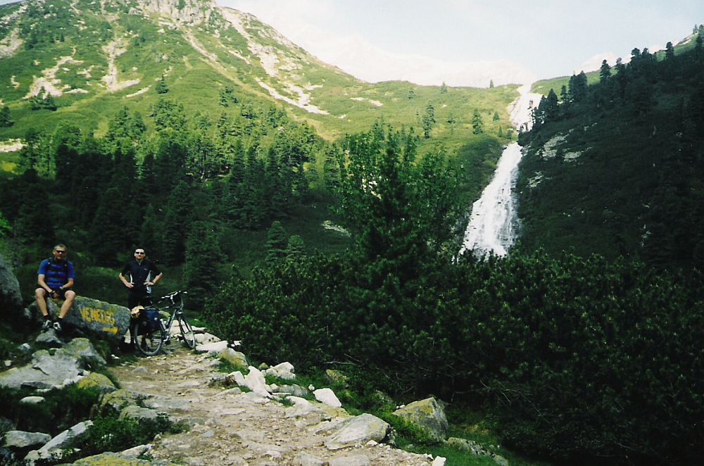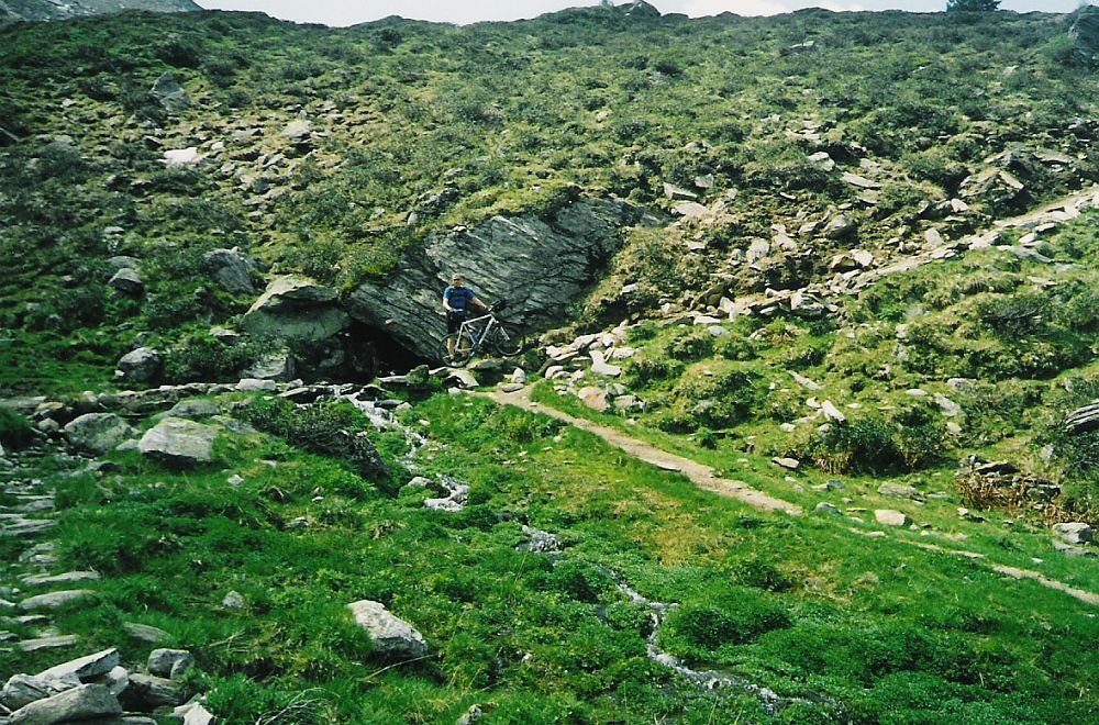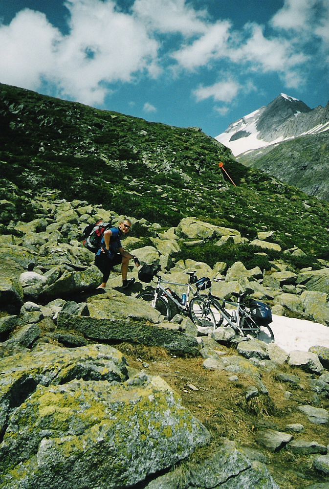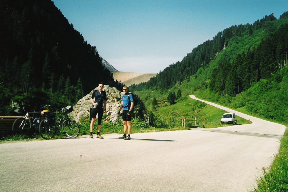 Im schattigen Zemmgrund starten wir am Gasthof Breitlahner um 8:30. Da die Sonne noch nicht über die Berge gekommen war, dachten wir, dass es besser wäre erst mal mit Jacken zu starten – nach 10 Minuten zogen wir die Jacken dann wieder aus. Ab dem Gasthof Breitlahner führt dann die asphaltierte Mautstraße (keine Maut für Fahrräder) gleich relativ steil bergauf. Hierauf folgen dann ein paar Serpentinen bis zum ersten Tunnel. Die sehr gut beleuchteten einspurigen Tunnels waren eine willkommene Abkühlung. Trotz einer vorhandenen Ampelschaltung ist es jedoch ratsam in den Tunnels die Räder zu schieben, da die Fahrbahn sehr schmal ist und sehr hohe Bordsteine hat. Außerdem haben uns die wenigen vorbeifahrenden Autos mit mindestens 80 Sachen überholt (zumindest kam uns das so vor). Insgesamt durchfuhren wir bis unterhalb der Staumauer 3 Tunnels (2 lange und ein kurzes). Die Straße führte uns durch den landschaftlich sehr schönen Zamsergrund bis zum Fuße der Staumauer. Von da an geht es noch mal knackig in Serpentinen und einem Tunnel zur Krone der Staumauer hoch, wo wir kurz den Ausblick auf die Gletscherwelt der Zillertaler Alpen genossen. Entlang des Sees und vorbei an Parkplätzen fuhren wir bis zum Kiosk Zamsgatterl. Hier endet die asphaltierte Straße und es beginnt ein relativ gut befestigter Wanderweg in Richtung Pfitscher-Joch. Bei einer längeren Verschnaufpause versuchten wir für die anstehende Trage- und Schiebepassage nochmals Kräfte zu mobilisieren. Der anfänglich gute Wanderweg (noch befahrbar) wurde nach ca. 700 m immer steiniger und steiler, so dass wir die Räder von dort an lieber schoben um die Abfahrt nach Sterzing noch genießen zu können. Der Weg macht einige Kurven und erreicht dann ein Hochplateau. Auf diesem flachen Weg mussten wir das Fahrrad über einen Bach tragen, an dem wir unsere schon leeren Trinkflaschen noch einmal aufgefüllt haben. Von hier aus konnte man den letzten Anstieg schon gut sehen und erahnen welche Anstrengung uns noch bevor stand. Auf dem immer felsiger werdenden Pfad konnten wir unsere Fahrräder schon gar nicht mehr schieben sondern mussten sie über und durch ca. ½ m hohe Felsen tragen und „wuchten“. Rü hatte hier eindeutig Vorteile, da sein Fahrrad wesentlich leichter war, als das mit 11 kg schweren Backrollern bestückte Fahrrad von Michael. Deshalb brauchte Michael auch nach einer ¾ Stunde erst mal eine Tupperdose voll Trockenobst um seinen Zuckerhaushalt wieder auszugleichen. Zeitweise konnten wir den Weg nicht mehr erkennen, da selbst die großen Felsbrocken schneebedeckt waren. Nach 3 Stunden Schinderei ab dem Kiosk erreichten wir das menschenleere Pfitscher-Joch-Haus auf 2.275 m. Die nun folgende 14 km lange Abfahrt war trotz der tollen Ausblicke keine wirkliche Belohnung für den Aufstieg, da die geschotterte Militärstraße in schlechtem Zustand ist und höchste Konzentration und Ausdauer an den Bremsen erfordert. Im Tal angekommen führt eine sehr breite Straße durch die menschenleere Gegend. Hier begegneten wir einem ca. 60-jährigen Österreicher auf seinem 30 Jahre alten 10-Gang-Trekkingfahrrad, der uns nach dem Weg zum Pfitscher-Joch fragte. Davon abgesehen, dass es bereits 15:30 Uhr war und dicke Regenwolken am Himmel aufzogen, rieten wir ihm in Stein zu übernachten und sich die Überquerung des Alpenhauptkammes noch einmal gut zu überlegen. Nach dem Stausee bei der Ortschaft Ried kam ein nach einem kurzen Anstieg eine sehr schöne Abfahrt.