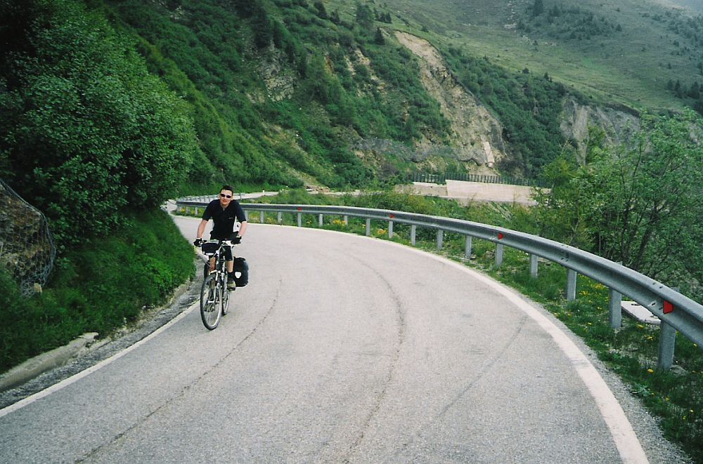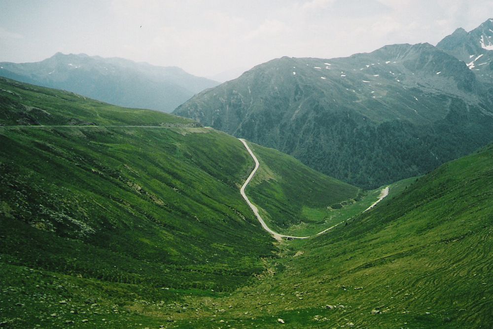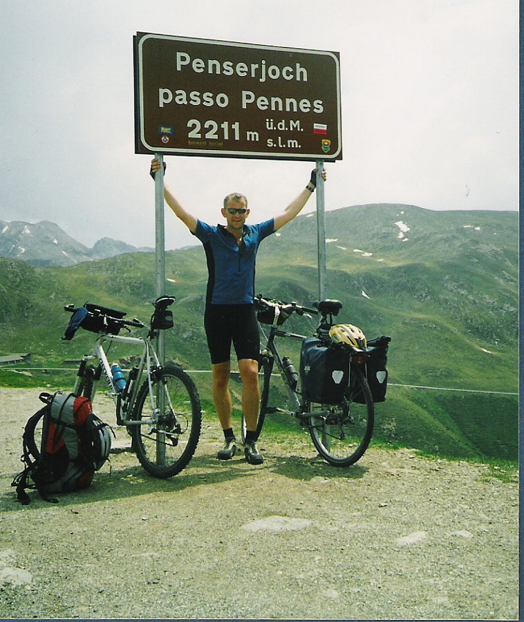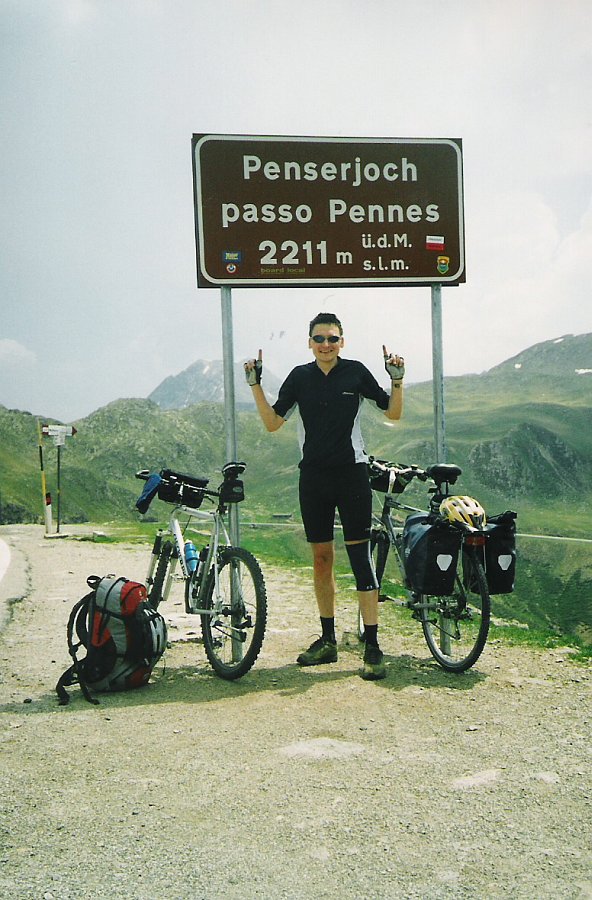 Gegen 8:40 Uhr verließen wir Sterzing auf einer stark befahrenen Straße unter der Brenner-Autobahn hindurch bis zur Abzweigung „Passo di Pennes“. Von hier sollte es 16 km nur bergauf gehen. Die schmale, wenig befahrene Passstraße führt uns erst mal am Hang entlang bergauf. Nach einer ¾ Stunde Fahrt und ca. 500 zurückgelegten Höhenmetern bemerkte Michael, dass sein Hinterrad am Rahmen anstreift. Dies wurde kurz darauf so schlimm, dass wir das Rad ausbauen mussten und anfänglich der Meinung waren, den Schaden selbst beheben zu können. Wir bemerkten jedoch, dass sämtliche Schrauben fest angezogen waren und das Spiel in der Nabe war. Von Bremsen zerstochen, beeilten wir uns das Rad wieder möglichst zentriert einzubauen. Von hier an konnte Michael nur mit sehr viel Gefühl in die Pedale treten, bei sehr steilen Passagen sogar nur schieben. Die Kilometersteine zählend, arbeiteten wir uns langsam aber stetig Höhenmeter für Höhenmeter den Berg hinauf. Nach ca. 2¾ Std. Fahrzeit haben wir dann zum ersten Mal das Penser-Joch-Haus gesehen. Die Straße geht jedoch in einem schier unendlich weiten Bogen hinauf zur Passhöhe auf 2.211 m. Nach 1600 Höhenmetern waren die letzten 3 km mit dem Ziel vor Augen eine echte Schinderei. Im relativ wenig besuchten Gasthof erholten wir uns von den Strapazen der letzten Stunden bei Kaffee und unverschämt teuren Wienerwürstchen (3,50 € nackig mit Brötchen und Serviette). Anders als am Tag zuvor, war diese Abfahrt die vorangegangenen Anstrengung wert. Super schöne Abfahrt auf guter Straße fast bis Astfeld – und das bei herrlichem Sonnenschein.